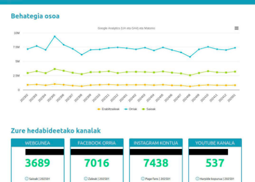 - Datuen jarraipenerako panel errazak: 60 BEHA panel baino gehiago sortu dira, hedabide bakoitzak bere web proiektuaren analitiken jarraipena euskaraz eta modu errazean egitea ahalbidetzeko. Eta, horrez gain, ingurune digital osoaren jarraipena modu ireki eta kolaboratiboan lantzeko Behategia Analytics tresna ere landu da.